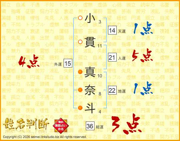 小(3画)貫(11画) 真(10画)奈(8画)斗(4画)