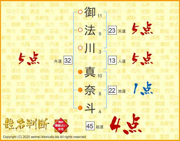 御(11画)法(9画)川(3画) 真(10画)奈(8画)斗(4画)