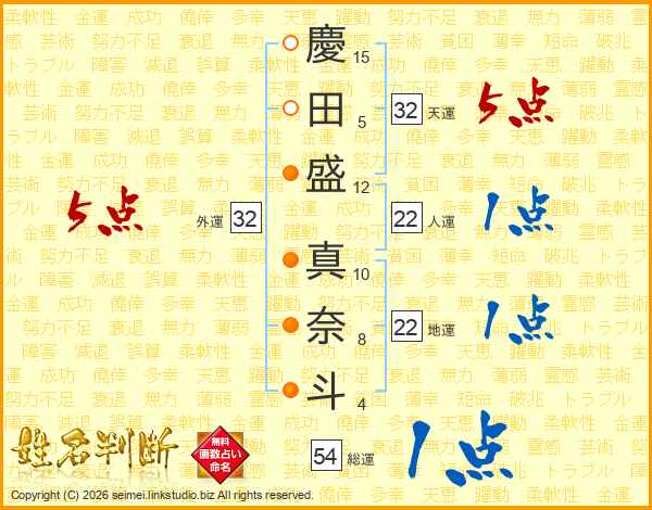 慶(15画)田(5画)盛(12画) 真(10画)奈(8画)斗(4画)