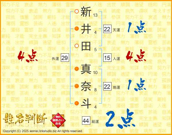 新(13画)井(4画)田(5画) 真(10画)奈(8画)斗(4画)