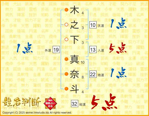 木(4画)之(3画)下(3画) 真(10画)奈(8画)斗(4画)