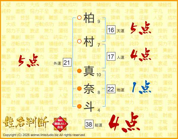 柏(9画)村(7画) 真(10画)奈(8画)斗(4画)