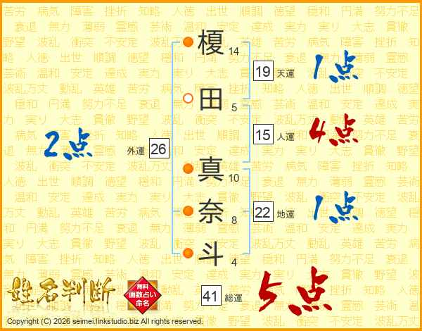 榎(14画)田(5画) 真(10画)奈(8画)斗(4画)