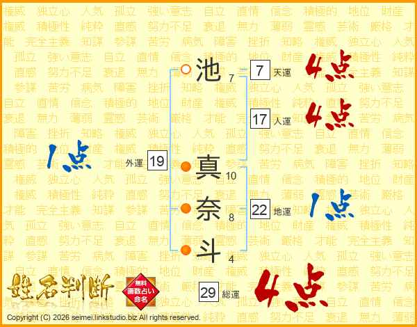 池(7画) 真(10画)奈(8画)斗(4画)