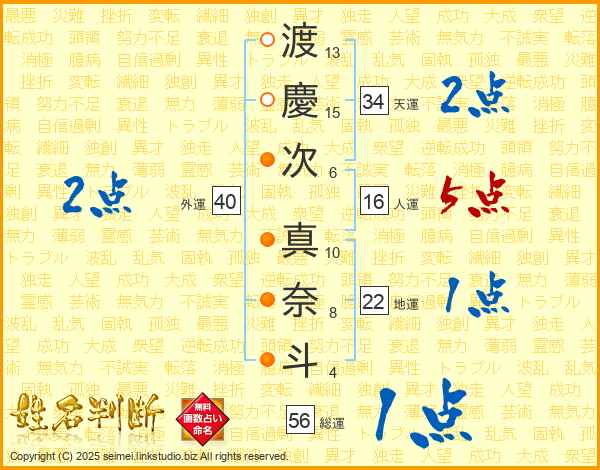 渡(13画)慶(15画)次(6画) 真(10画)奈(8画)斗(4画)