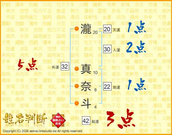 瀧真奈斗さんの外運は32画の5点!