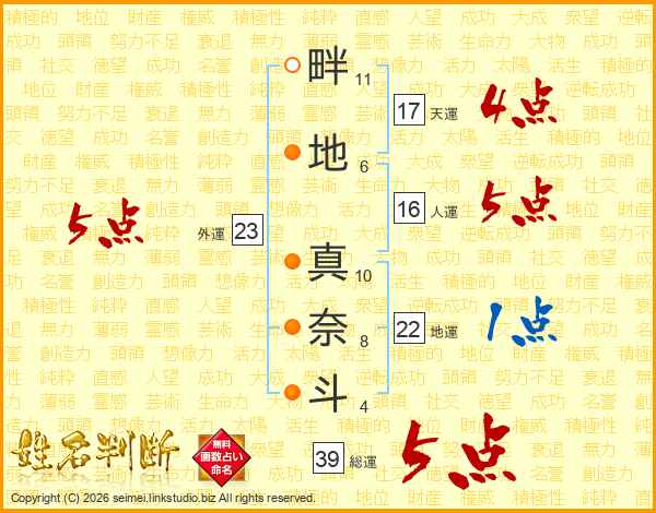 畔(11画)地(6画) 真(10画)奈(8画)斗(4画)