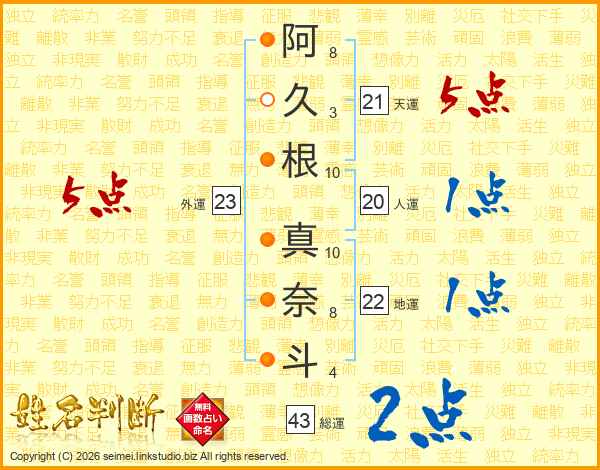 阿久根真奈斗さんの総運は43画の2点!