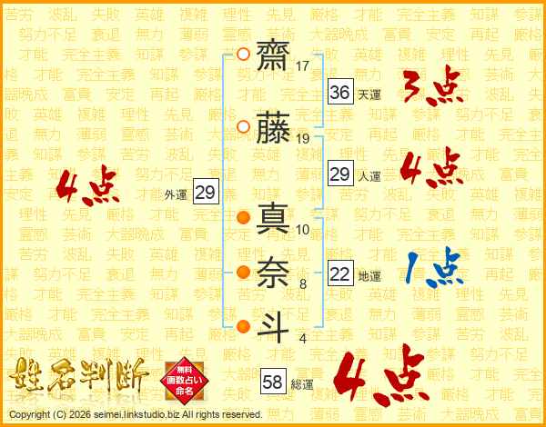 齋(17画)藤(19画) 真(10画)奈(8画)斗(4画)