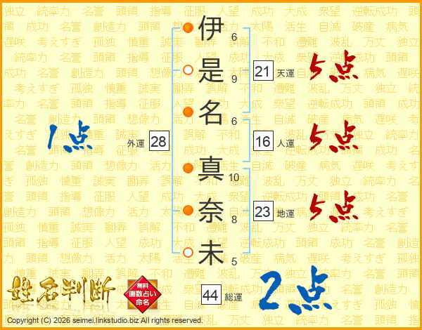 伊(6画)是(9画)名(6画) 真(10画)奈(8画)未(5画)