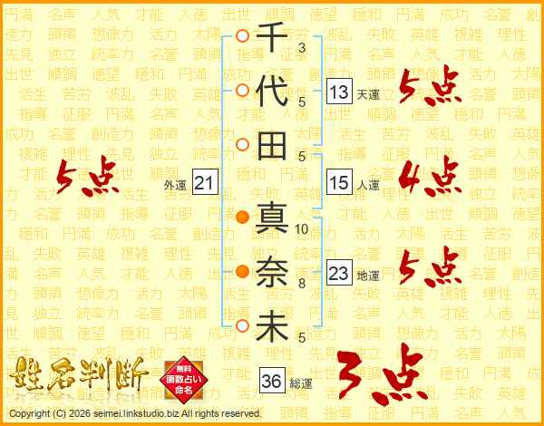 千(3画)代(5画)田(5画) 真(10画)奈(8画)未(5画)