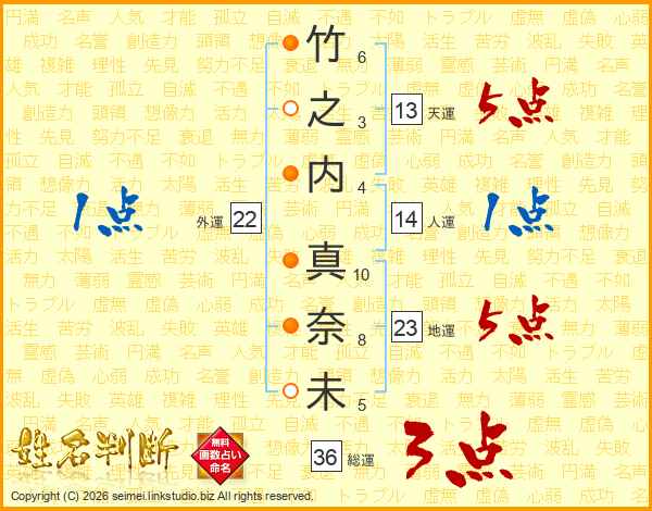 竹(6画)之(3画)内(4画) 真(10画)奈(8画)未(5画)