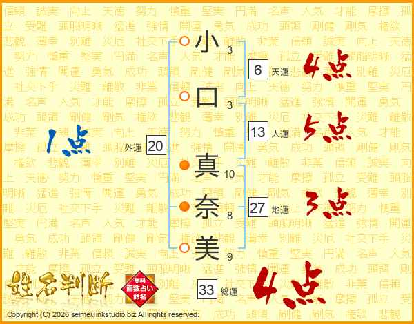 小口真奈美さんの総運は33画の4点!