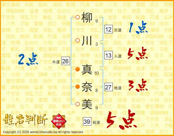 柳川真奈美さんの総運は39画の5点!