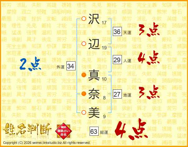 沢(17画)辺(19画) 真(10画)奈(8画)美(9画)