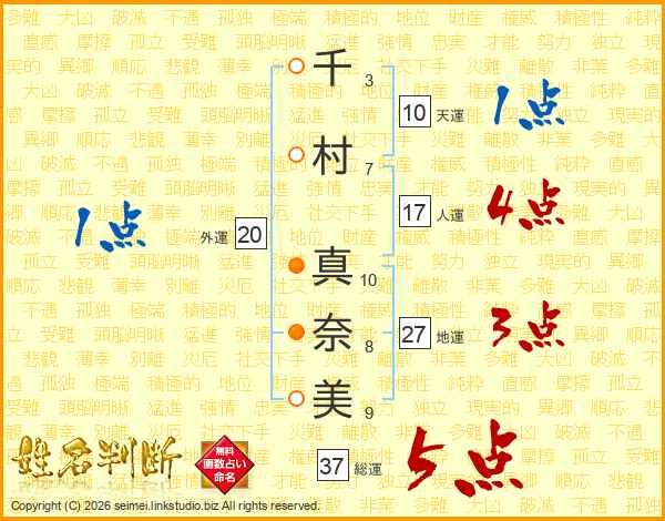 千(3画)村(7画) 真(10画)奈(8画)美(9画)