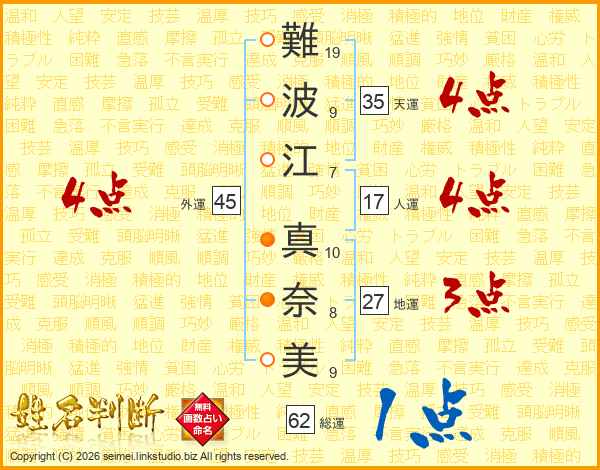 難(19画)波(9画)江(7画) 真(10画)奈(8画)美(9画)
