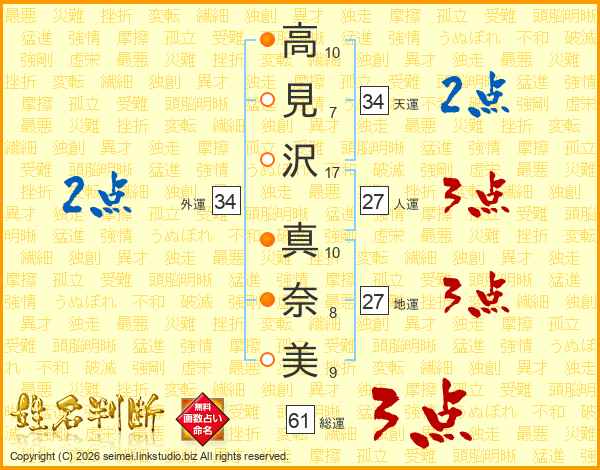 高(10画)見(7画)沢(17画) 真(10画)奈(8画)美(9画)