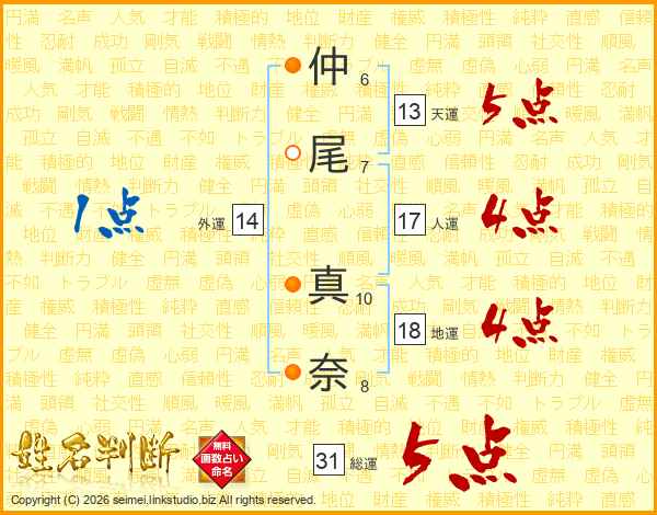 仲(6画)尾(7画) 真(10画)奈(8画)