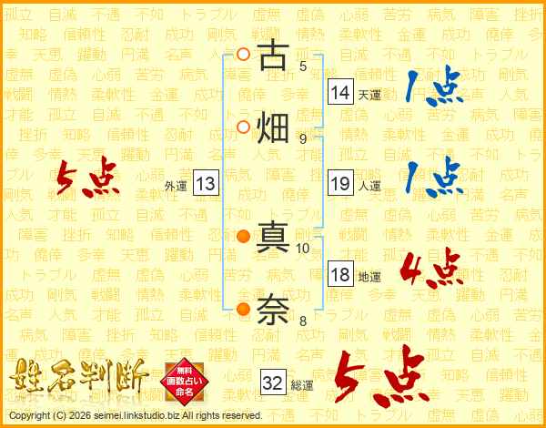 古(5画)畑(9画) 真(10画)奈(8画)