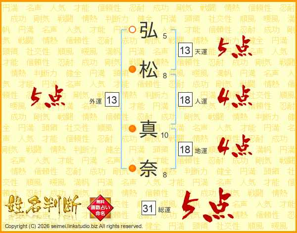 弘(5画)松(8画) 真(10画)奈(8画)