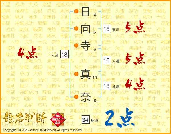 日(4画)向(6画)寺(6画) 真(10画)奈(8画)