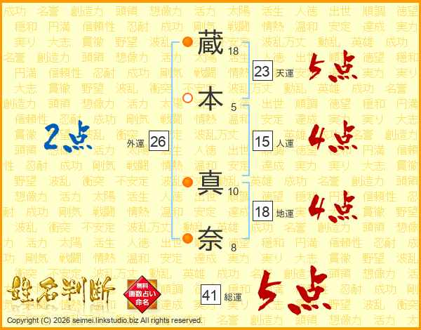 蔵(18画)本(5画) 真(10画)奈(8画)