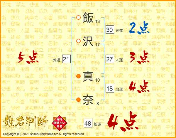 飯(13画)沢(17画) 真(10画)奈(8画)