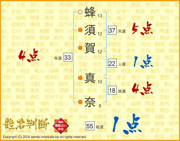 蜂(13画)須(12画)賀(12画) 真(10画)奈(8画)