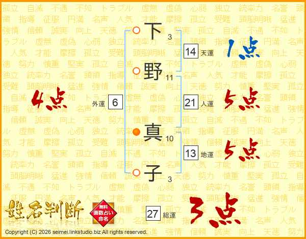 生活面を象徴する運勢です。外部から受ける影響力を表し、結婚運、家庭運や職場、環境への順応性を表します。総運から人運を引いた画数。姓や名が1文字の場合を除く。