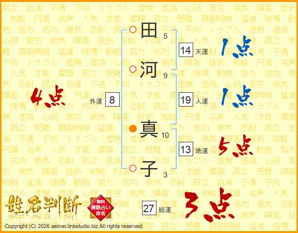 生活面を象徴する運勢です。外部から受ける影響力を表し、結婚運、家庭運や職場、環境への順応性を表します。総運から人運を引いた画数。姓や名が1文字の場合を除く。