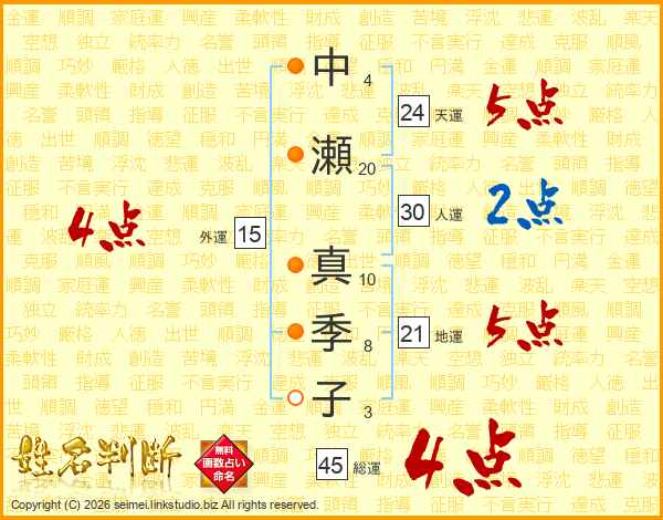 中瀬真季子さんの総運は45画の4点!