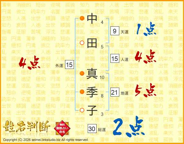 中(4画)田(5画) 真(10画)季(8画)子(3画)