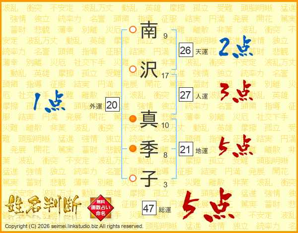 南(9画)沢(17画) 真(10画)季(8画)子(3画)