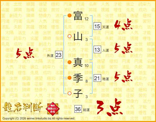 富(12画)山(3画) 真(10画)季(8画)子(3画)