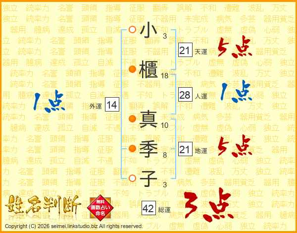 小櫃真季子さんの天運は21画の5点!