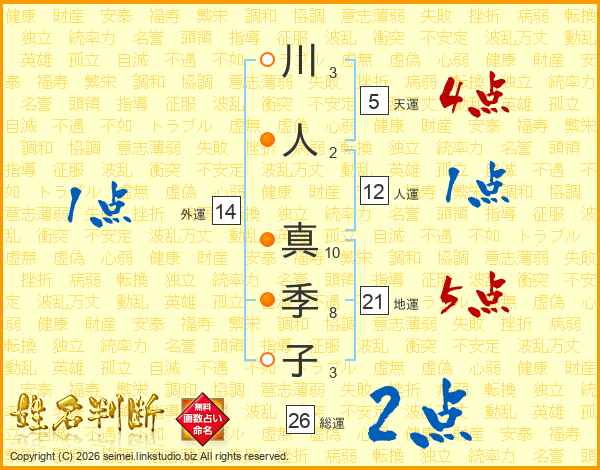 川(3画)人(2画) 真(10画)季(8画)子(3画)