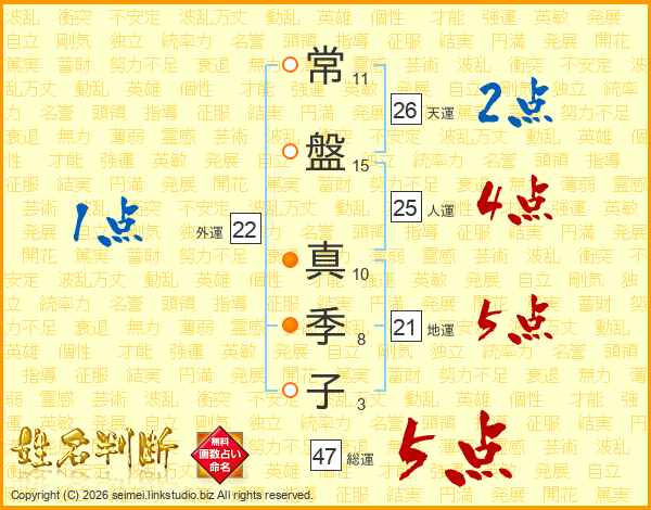 常(11画)盤(15画) 真(10画)季(8画)子(3画)
