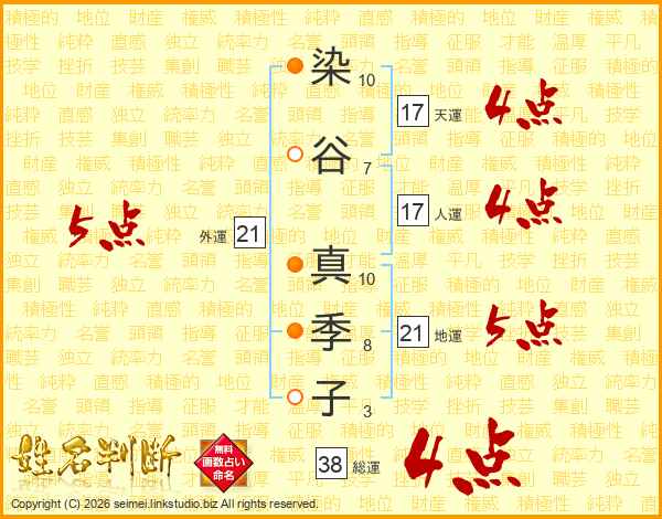 染(10画)谷(7画) 真(10画)季(8画)子(3画)