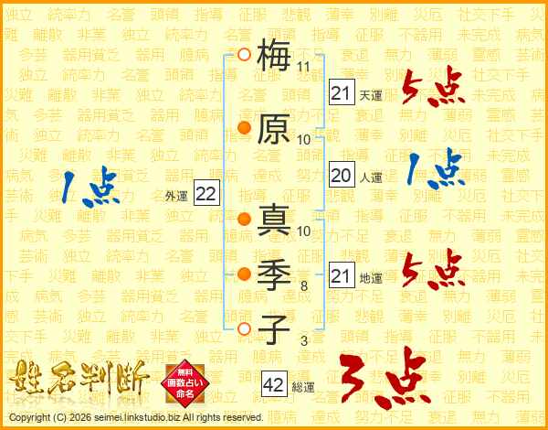 梅(11画)原(10画) 真(10画)季(8画)子(3画)