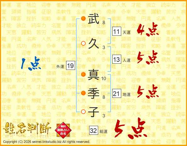 武(8画)久(3画) 真(10画)季(8画)子(3画)