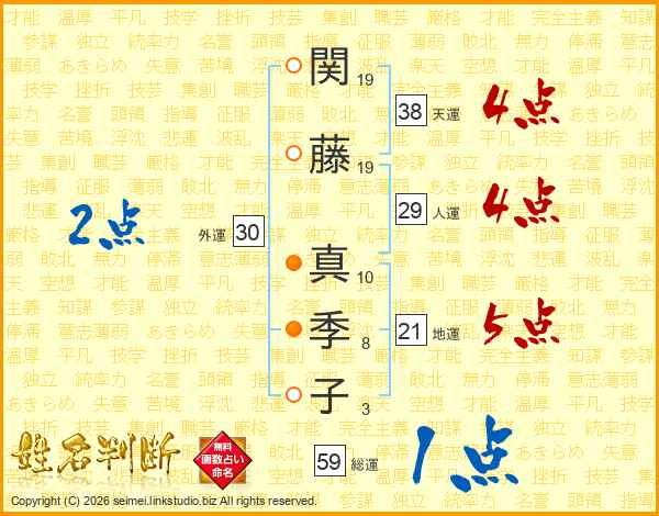 関(19画)藤(19画) 真(10画)季(8画)子(3画)