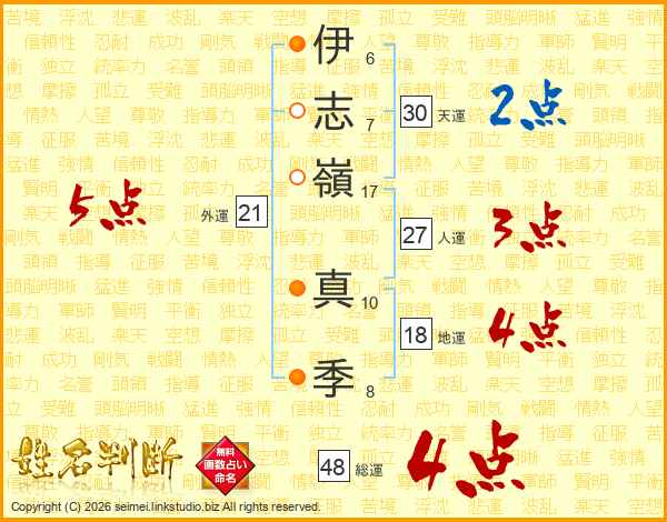 伊(6画)志(7画)嶺(17画) 真(10画)季(8画)