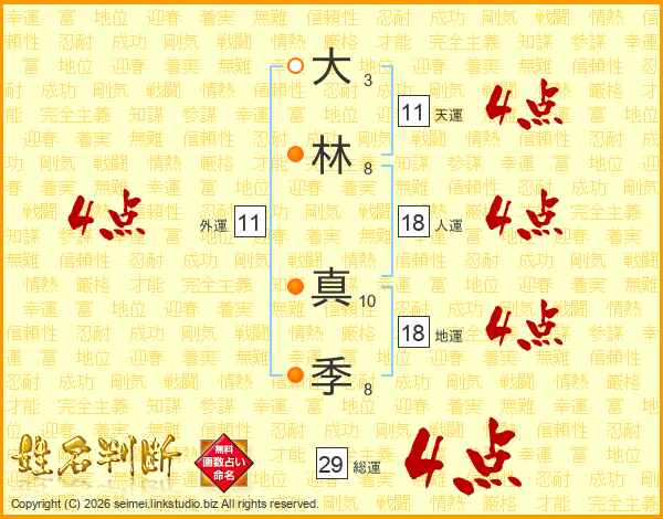 あなたの人生を表す1番重要な運勢です。生涯を通じて影響する総合運となり、主に50歳以降の晩年期に影響を及ぼします。苗字と名前の合計画数。