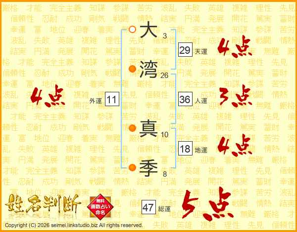 あなたの人生を表す1番重要な運勢です。生涯を通じて影響する総合運となり、主に50歳以降の晩年期に影響を及ぼします。苗字と名前の合計画数。