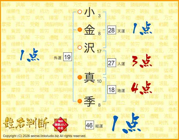 小(3画)金(8画)沢(17画) 真(10画)季(8画)