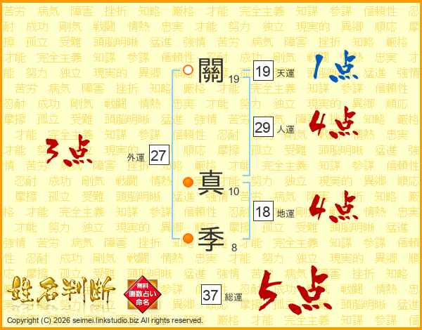 あなたの人生を表す1番重要な運勢です。生涯を通じて影響する総合運となり、主に50歳以降の晩年期に影響を及ぼします。苗字と名前の合計画数。