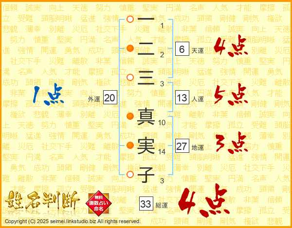 生活面を象徴する運勢です。外部から受ける影響力を表し、結婚運、家庭運や職場、環境への順応性を表します。総運から人運を引いた画数。姓や名が1文字の場合を除く。