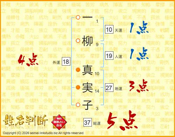 一(1画)柳(9画) 真(10画)実(14画)子(3画)