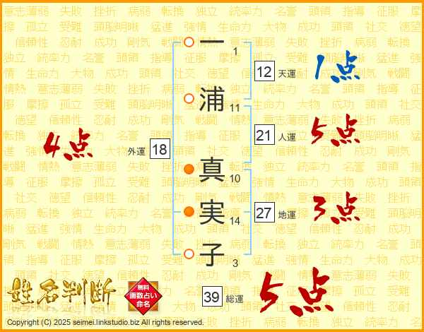 一(1画)浦(11画) 真(10画)実(14画)子(3画)